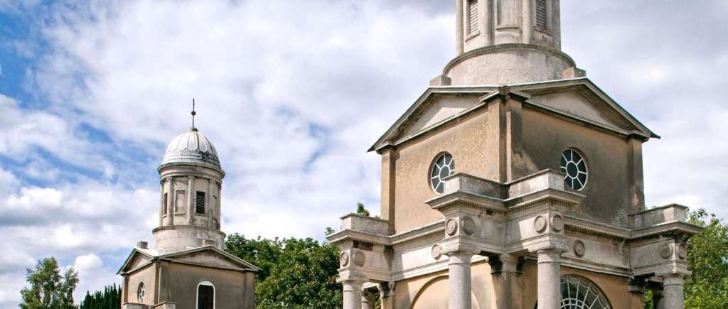Two porticoed classical towers, which stood at each end of a grandiose but highly unconventional Georgian church, designed by Robert Adam in 1776.